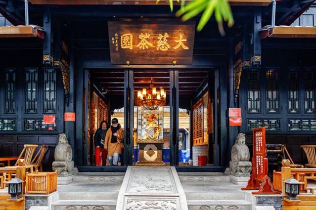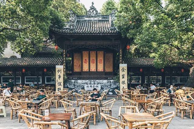 在成都宇宙中心太古里的核心区伫立着一座千年古刹,大慈寺。而大慈茶社就藏身在大慈寺中。里面零零散散铺满竹椅茶桌,有露天坝也有室内,晒太阳、吃地道小吃,再听评书下茶,说书人坐在高脚椅上手拿折扇和惊堂木,用四川方言讲的听客合不拢嘴。