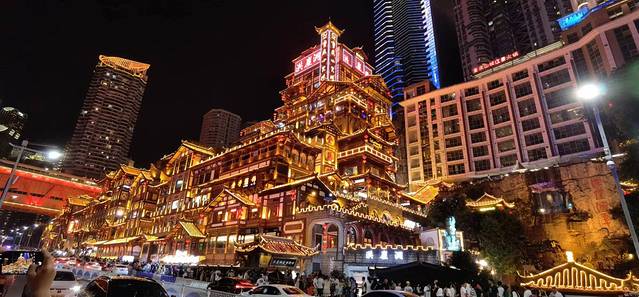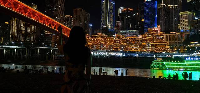 从解放碑可以步行到洪崖洞,但是走的是洪崖洞的上面,要下到一楼路边照相比较好看,电梯是拍不上的,只能从11楼暴走下楼。第一天拍的就是洪崖洞跟前的景色,第二天去的对面江滩公园,人真的是摩肩接踵,还有专门带路的,但其实也没啥必要。