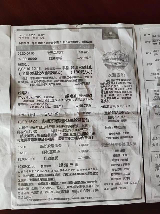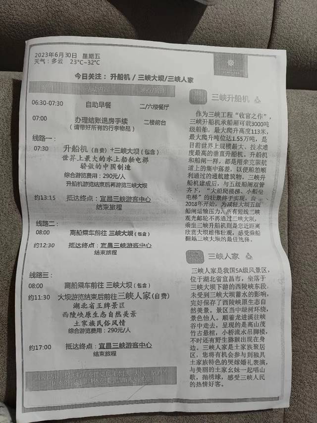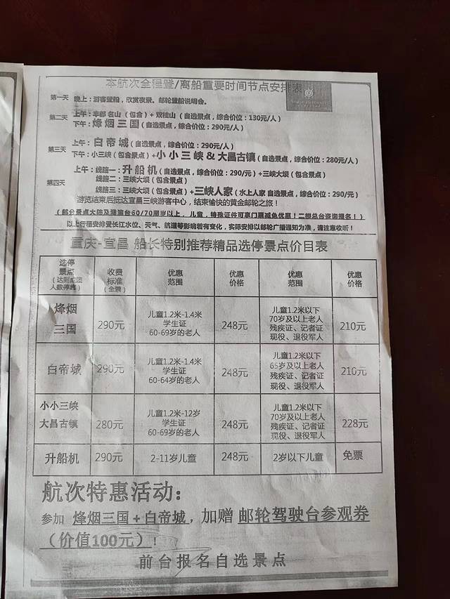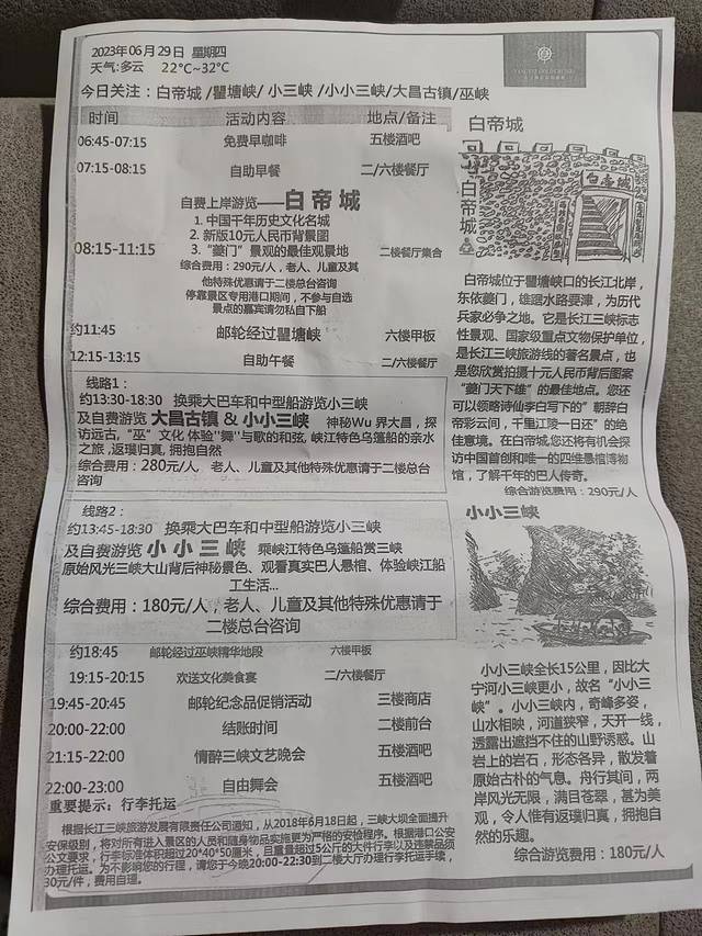 面对着家里的地图研究去哪儿玩比较好,尴尬的是赶上暑期刚开始,价格都开始有所上涨,后来就想着去三峡坐邮轮,也是第一次坐邮轮刚好也是一种新玩法。第一件事就是查询邮轮班次,在公众号上定了长江黄金1号的轮船,4天3晚的行程,后面都会有介绍,包括邮轮怎么选择,要注意什么。下面就是这几天的行程安排
