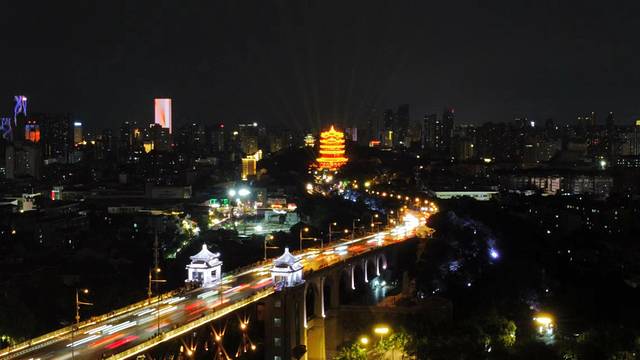 无人机拍到的大桥和黄鹤楼夜景,晚上的黄鹤楼有灯光秀和演出。