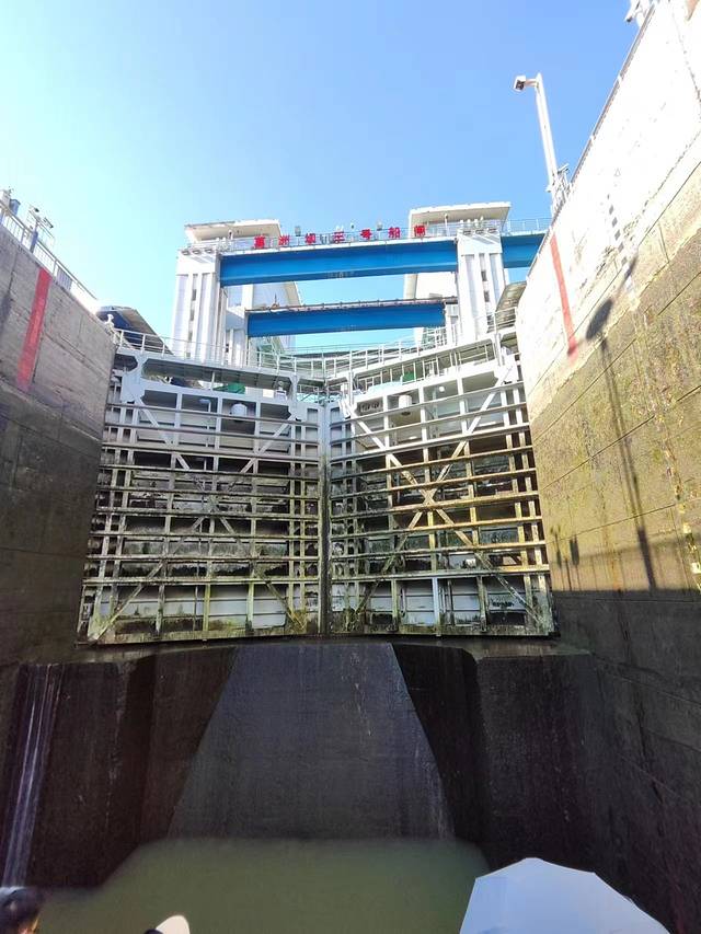快进宜昌市的时候,就要过葛洲坝船闸,就是要排队,一个穿一个船过闸,排队排了1个小时,水降了20多米,然后就能进入到宜昌市