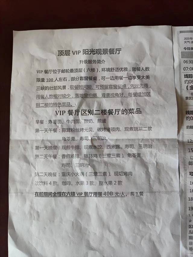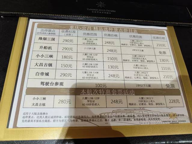 关于升舱和升餐,我们定的是标准间2150一个人(三峡游轮公众号上各种邮轮各种房型的视频),进房间以后首先楼层低,阳台有遮挡,其实房间小,床尾到电视只有半米距离,后来就要求升舱,升舱速度也要快,我们升的时候3、4、5楼各剩一个房间可以选择,最后选择了4楼,加了800元,但是房子舒服了是真舒服。另外,建议大家在公众号上定最差的房型,然后上船升级,这样会便宜一些,但是风险就是可能会没有房间。升餐是从普通餐厅2楼升到VIP的6楼,菜品会多一些,都是自助餐形式,船员会推荐你升餐,理由是普通餐厅要排队,要拼桌,但是真的不影响,拼桌是固定位置,十人一桌,普通餐厅吃的也很好,味道不错,排队到开始吃饭也就5分钟,菜品类很多,水果两种,汤粥三种,饮品两种,如果对餐饮要求不高的话,普通餐厅真的不错。钱用在换房间上更划算一些。