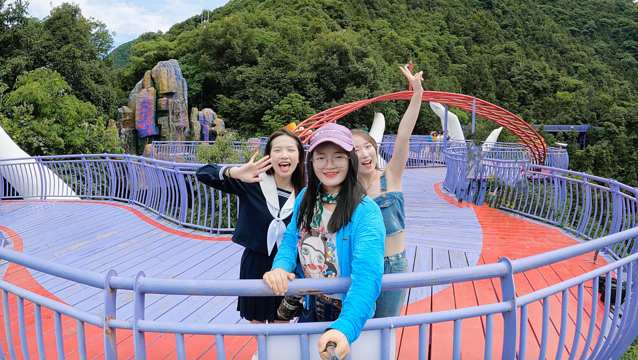 检票口-紫藤花长廊-飞天魔毯-紫绫纤手(喊泉)-云梯天桥- 紫金 花悬崖眺台/天空之境-天子洞-紫龙峽高空玻璃漂流-恐龙乐园-7D天空飞船