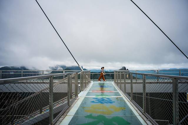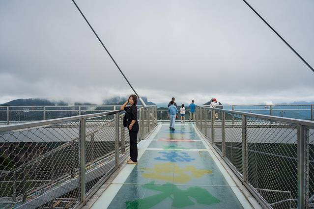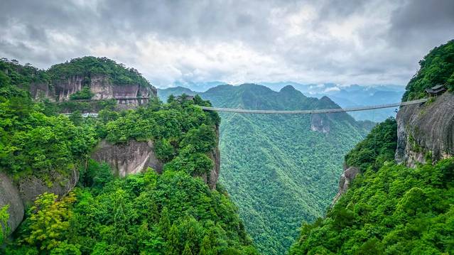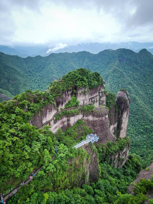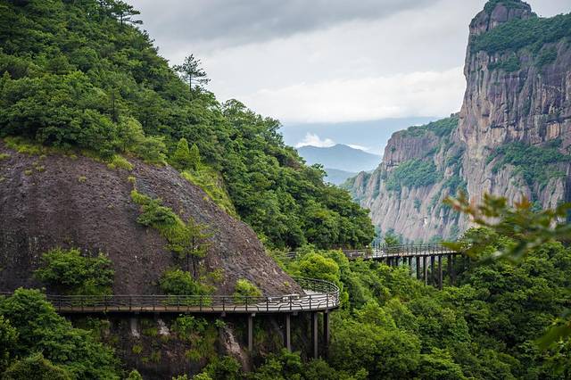 「南天顶观景台」是神仙居的最高处,整个观景台是用玻璃建成,矗立在海拔869米的悬崖峭壁之上,凌空而架。