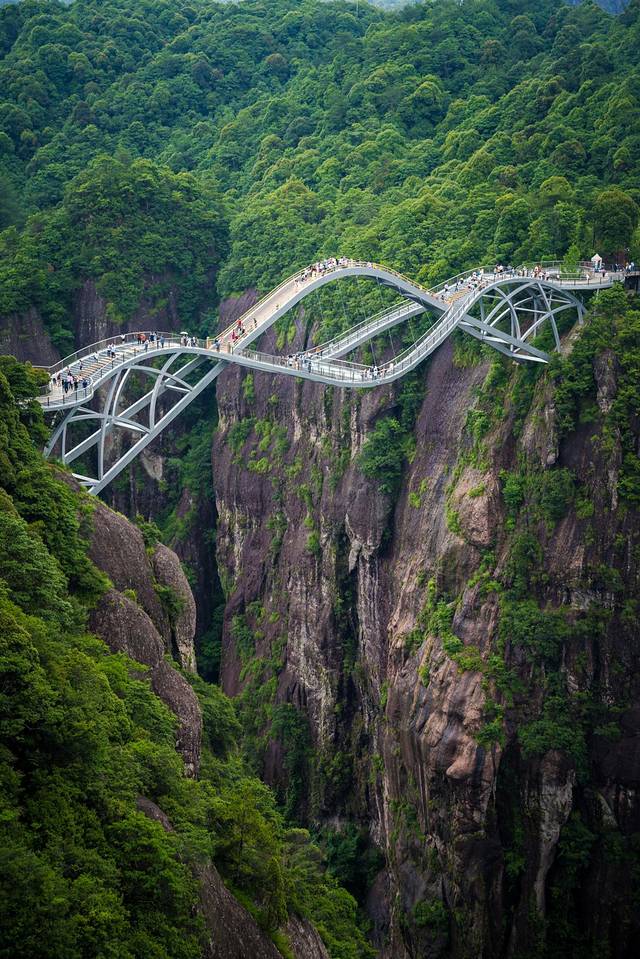 如意桥,这座凌架于百米高空的桥梁,刚柔并济的造型与神仙居的自然风光完美地融为一体,宛如一柄空中的玉如意,又似仙女的披帛。走在桥下,脚下就是深渊绝壁,感受到心跳的加速。站在桥上将美景尽收眼中,也会有一览众山小之感观。