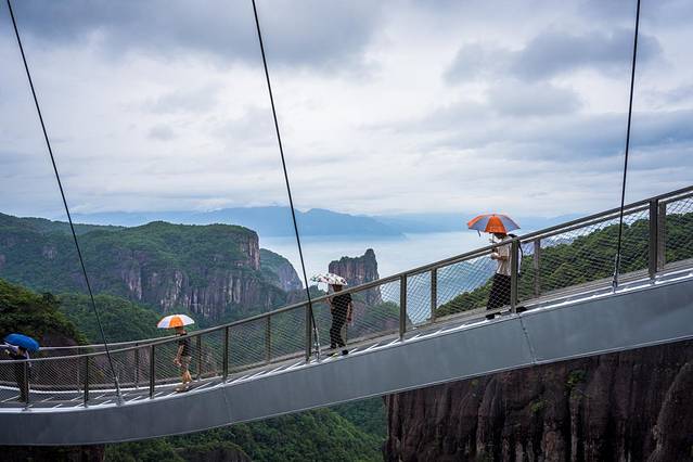 玻璃平台分两层,从高空俯瞰下形如太空飞船和远洋游轮,非常壮观。登上南天顶的二层,就能体验到“步步惊心”,在这里能眺望到山岳绵延、云海滚滚,是神仙居的最佳观景点。