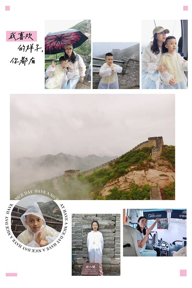 不过下雨也有好处——凉爽。而且因为没有看升旗,赶早来到了八达岭。都是家长带孩子,下雨爬长城也不太安全,所以大家一致决定,缆车上下。雨中长城,粗犷中平添一份朦胧美。一个小时游览完。