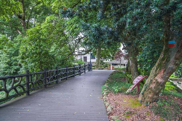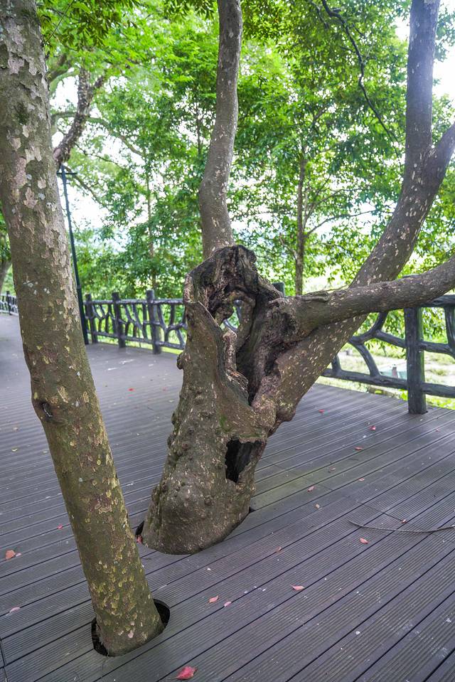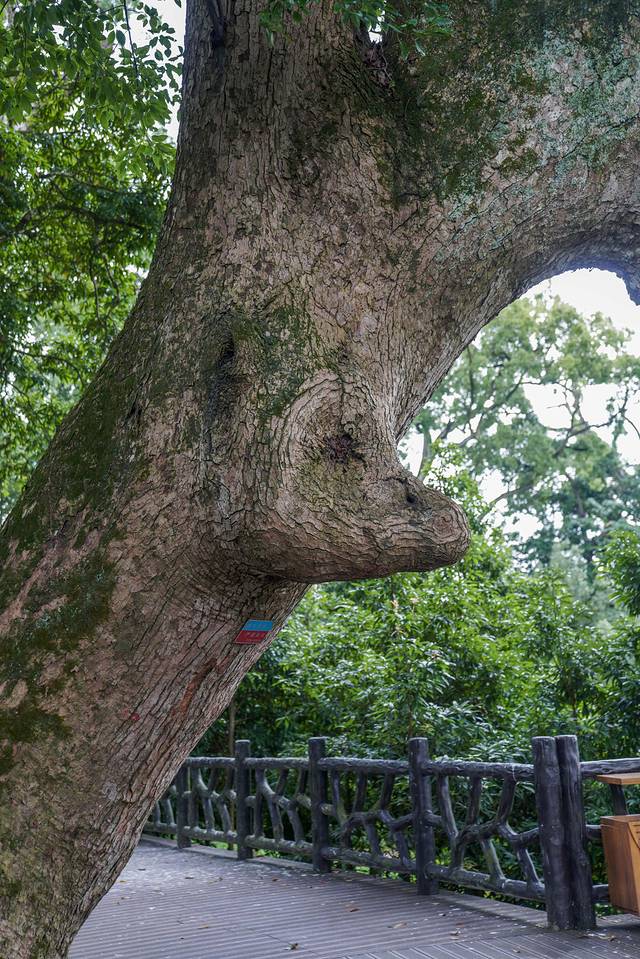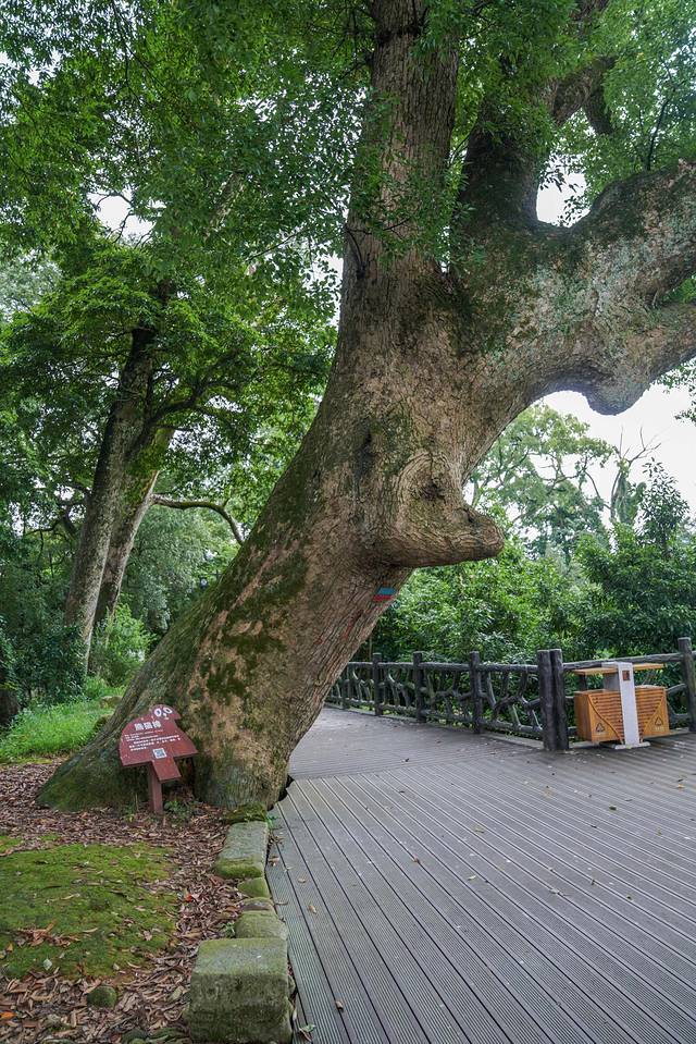 这条古树长廊距今有1000多年的历史了樟树奇形怪状,有枯萎的树枝根部伫立在栈道中间
