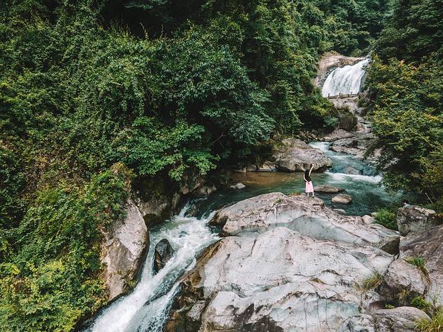 徒步山路探寻瀑布绝对是徒步爱好者的好去处,萝卜潭瀑布八潭八瀑连贯而泻,从高空看就像串联的珠子,蔚为壮观。