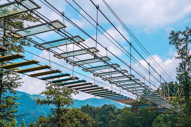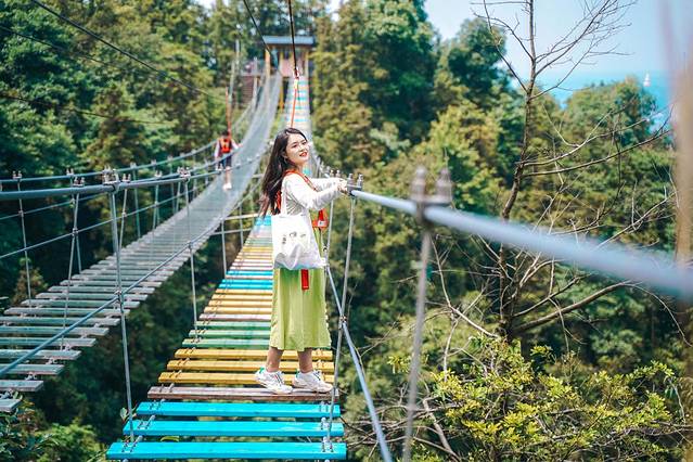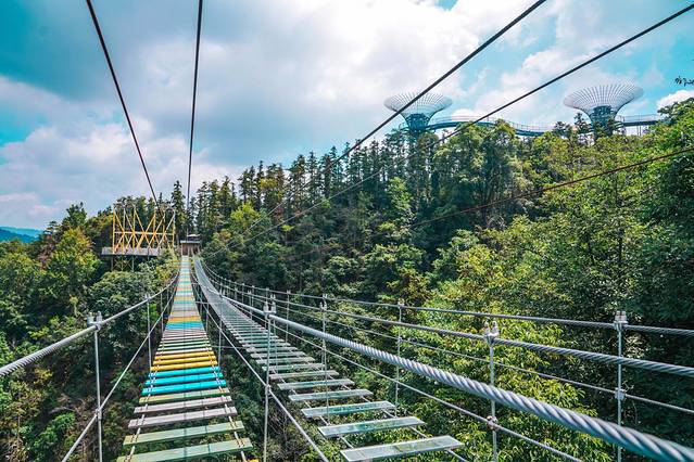 步步惊心这是一项高空刺激项目,彩色的天梯连接在两座山的峭壁之间勇敢的我一定要挑战这个项目。
