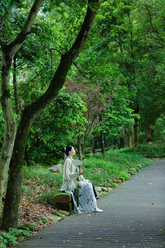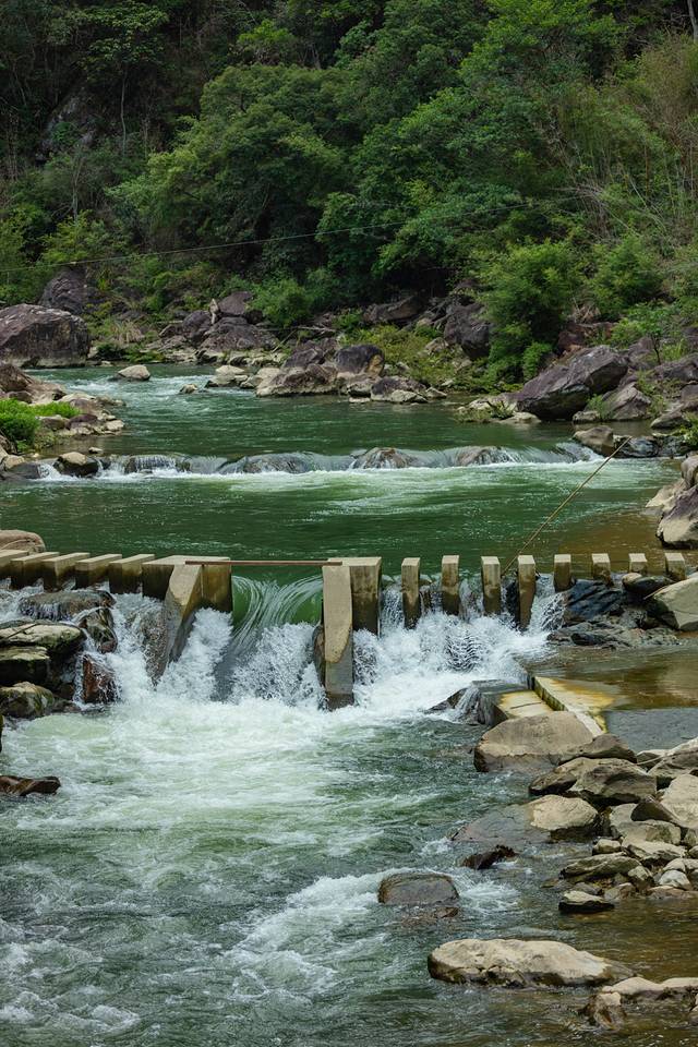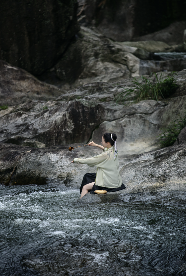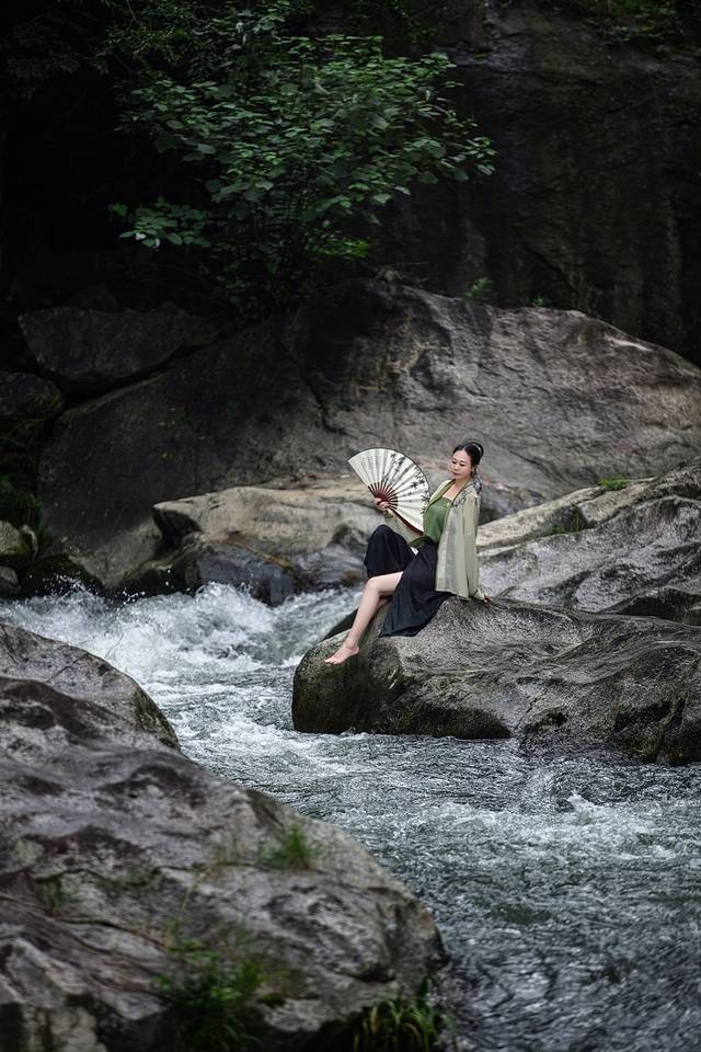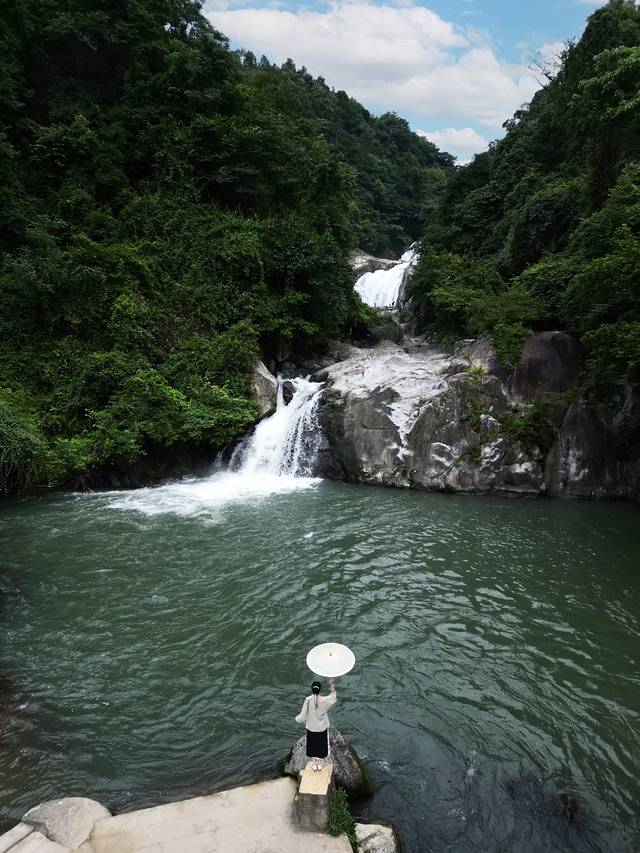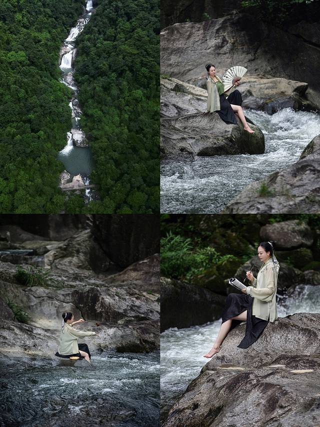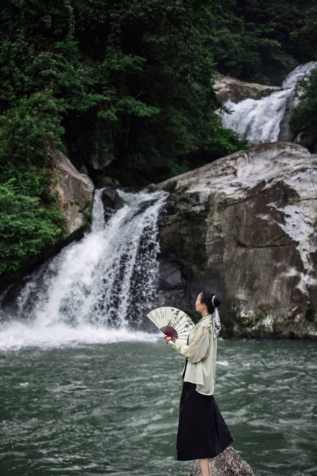 清澈的水花,清凉而美丽。水声仿佛是一首美妙的音乐,经久不息地回荡在蓝天和密林深处。萝卜潭真的很适合穿汉服,是一秒如画的既视感。