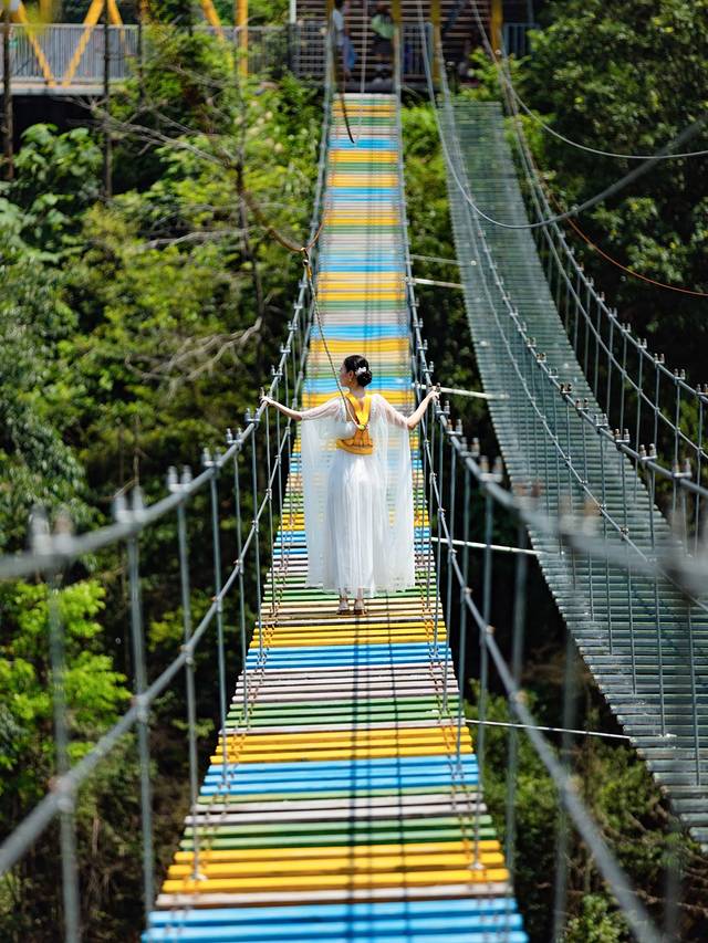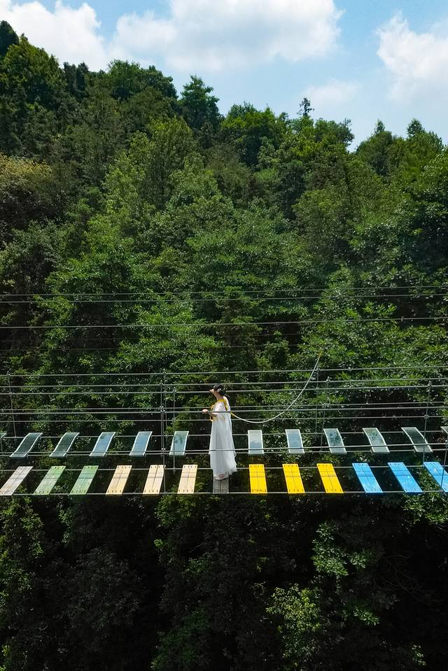 “步步惊心”悬于两山峭壁之间,没有钢筋水泥的阻碍,你需要大胆地迈出每一步。步步惊心有两条,一条是彩色的木板,一条是透明的玻璃,喜欢挑战的可以选择玻璃的,间距更大,视觉效果更刺激。