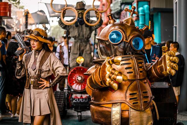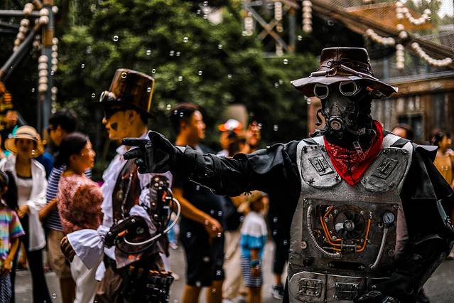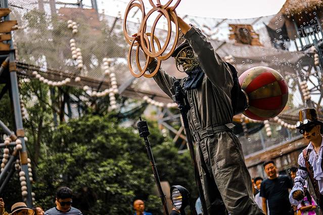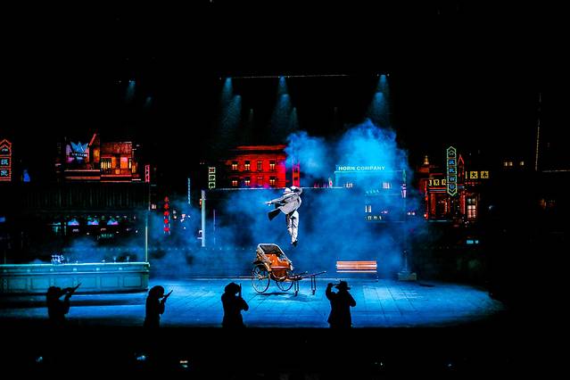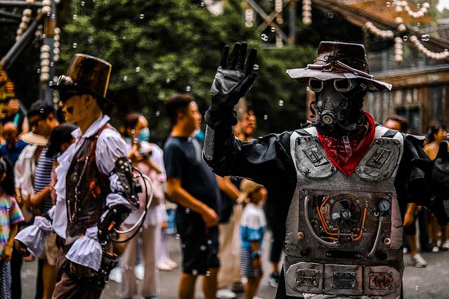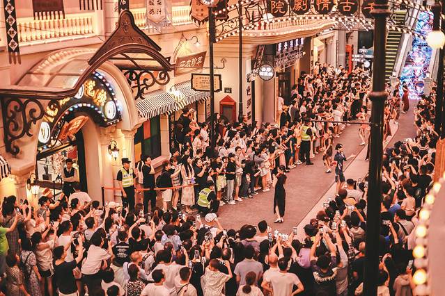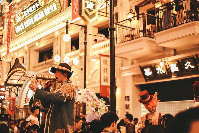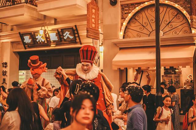 必看的三大演出,徜徉于穿越街、时空街、千古情街,仿佛时空穿越,身着旗袍、朋克、超现代的着装,在过去、现在、未来之间切换身份,一个又一个的快闪和演出,让你目不暇接。