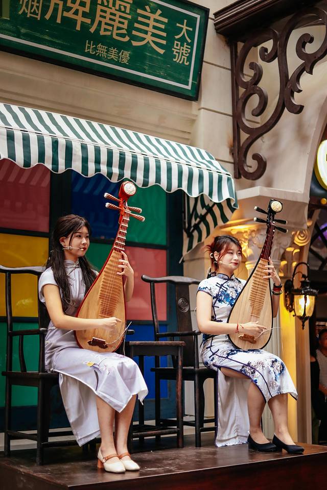 来上海怎么能上得了评弹,在穿越街上的两位穿着旗袍拿着琵琶的小姐妹,很民国风的建筑很搭,喜欢拍照的还可以换装体验,一秒穿越到那个年代