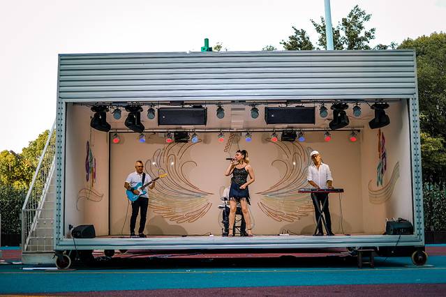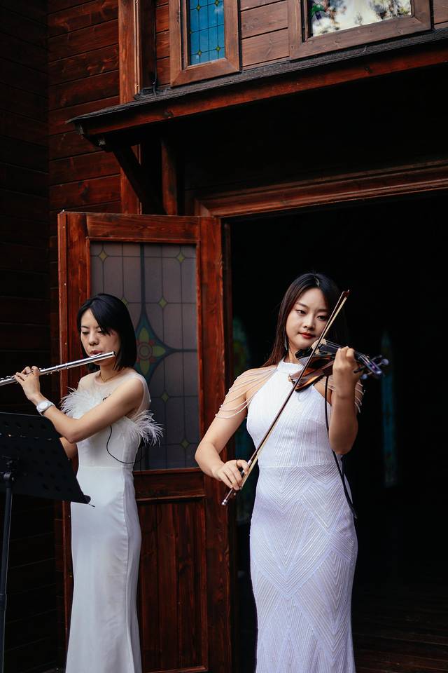 走进浪漫的爱情广场,教堂前身着白色礼服的演奏家们,小提琴、电子琴、笛子等合奏了出美妙的音乐来