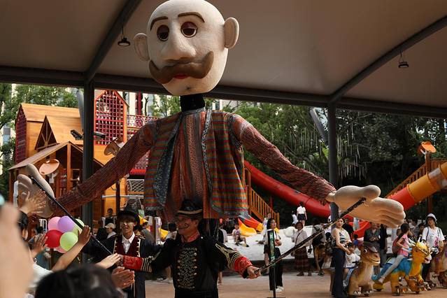 沉浸式亲子互动,大型的长颈鹿等各种玩偶依次与小朋友互动
