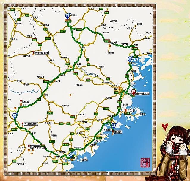 路线:福州/宁德市(白水洋)/武夷山/玉华溶洞/三明市(沙县小吃)/古田会议会址/冠豸(zhai)山和培田古镇/永定土楼和云水谣古镇/厦门市(鼓浪屿)/莆田市(湄洲岛)/福清市(港头镇芦花村寻亲)/福州市(三坊七巷),全程沿着福建省界边线,逆时针方向行驶约1700公里。长春龙嘉机场乘机往返福建长乐机场。