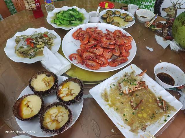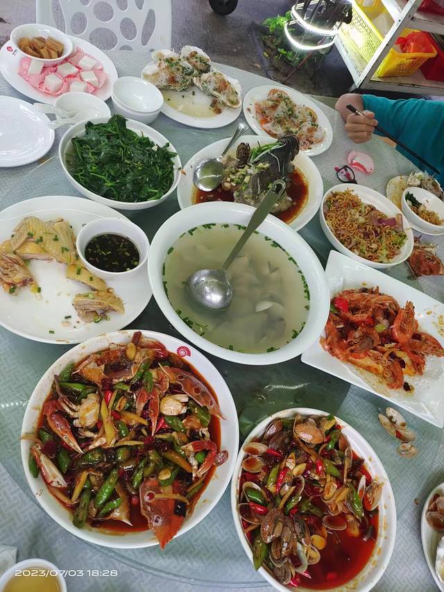我们身上都是湿的,在船上给弟弟换了干衣服,回来让他们洗了热水澡,找了个包接送的餐馆吃东西,也是美团的,没有踩坑,但是看评论人多了服务就不行了。我们点了个6人餐,老板都震惊了。最后除了老板家送的椰子糕,基本都吃完了,嘿嘿。