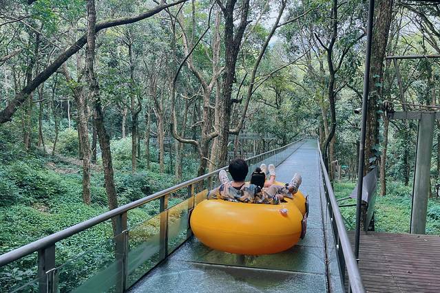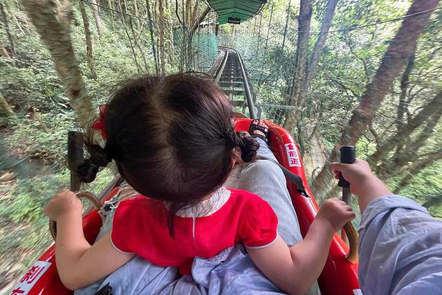 出了洞,走进天成野槠林,穿过长长的山洞,是另一番天地,山野虽静幽,但趣味还是满满的。下山可以直接乘坐云霄飞车和玻璃栈道漂流。云霄飞车下滑距离400余米,速度自己控制,可快可慢,尽情享受山野的美景。玻璃栈道漂流,皮艇穿梭在山间,缓缓顺流而下,很是享受。有了这两个项目,下山就轻松多了。