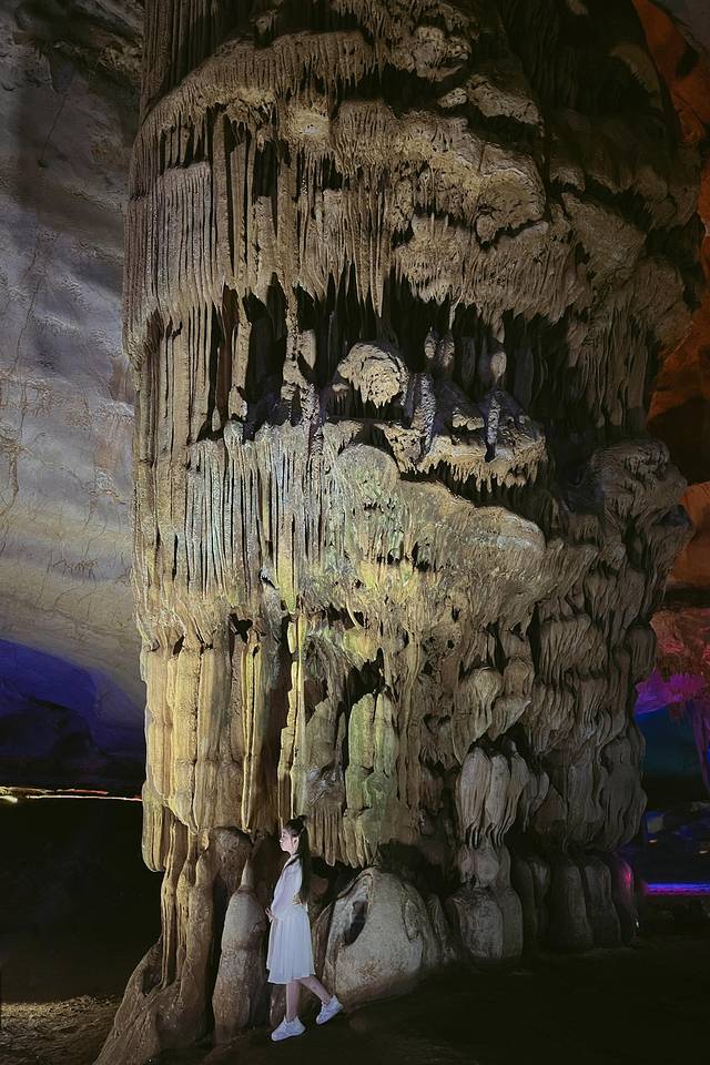 钟乳石的造型千奇百怪,靠想象给它们命名,比如“比萨斜塔”、“黄果树瀑布”等,其中最大的钟乳石“擎天玉柱”高达20米,实为壮观。另外还有一块因为洞内震动而断裂的大岩石,留下了一条窄窄的通道,形成了“一线天”。