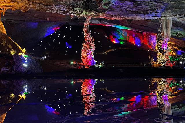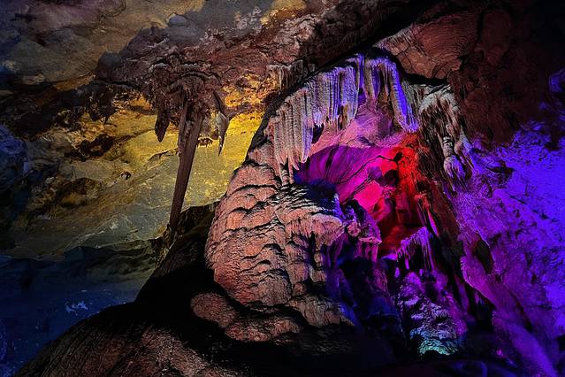 直接导航富春桃源停车场,坐上富春云梯,直达山上的九霄碧云洞,天然的空调房就在此了,洞内常年18度,冬暖夏凉,而且此洞厅之大,是国内罕见的,被称“亚太第一洞厅”,洞厅里还有一片池水,倒影着布满灯光的钟乳石奇观,堪称富阳的“盐湖”。