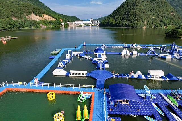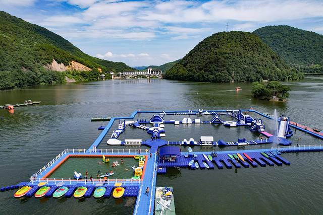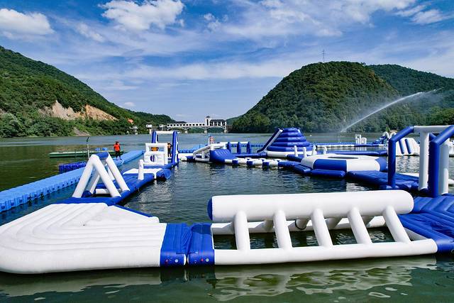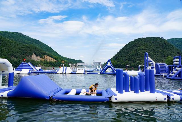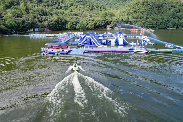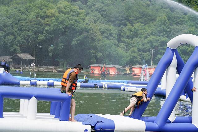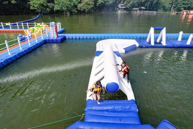 湖心岛造浪乐园是一座搭建在水上的嬉水园,有40多个闯关模块,等待大小朋友来解锁。