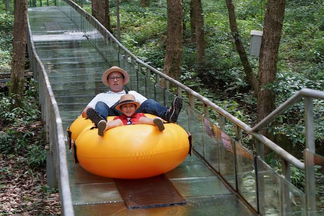 夏天还有什么比漂流更快乐的呢?景区考虑周全,云霄飞车省了一半的下山脚力,另一半交给了玻璃滑道漂流。富春桃源景区的玻璃水滑道有近百米落差,可以体验360°双回旋漂流,感受森林中的速度与激情。