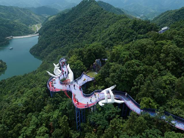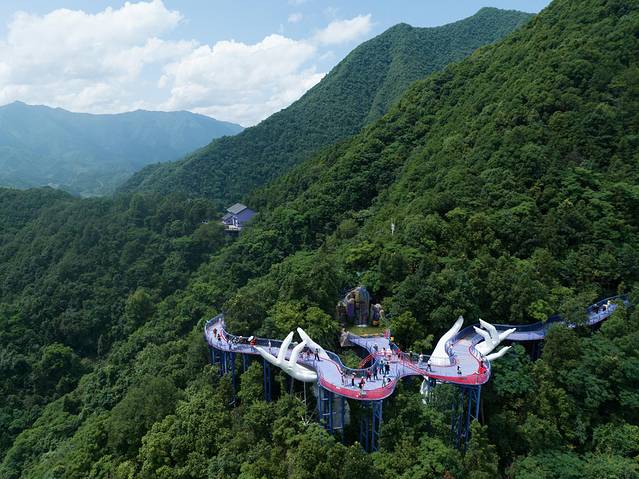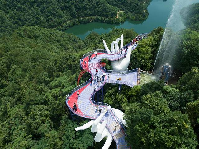紫绫纤手的名字听起来就有一股仙气,山谷与湖泊间,两个巨大的手掌托起一条紫色的步行栈道,尤其在航拍的视角下,很有气势。