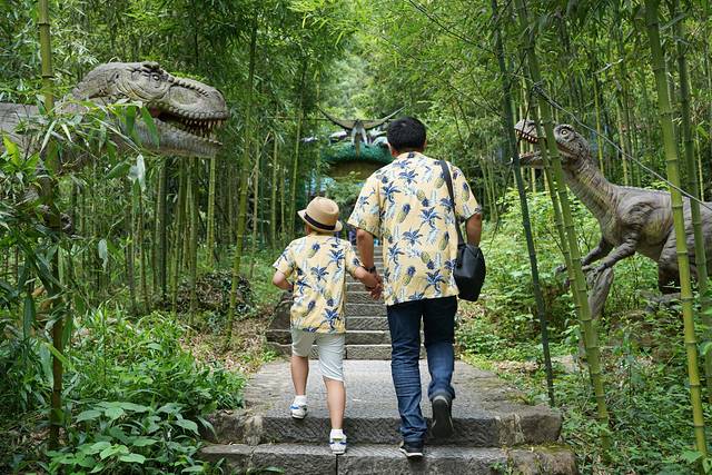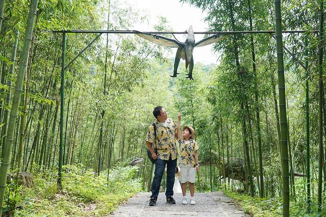 竹林里造型生动逼真的几十只恐龙,是小朋友的大爱,仿佛穿越到侏罗纪时代,有趣的恐龙滑梯和骑恐龙也是加分项。