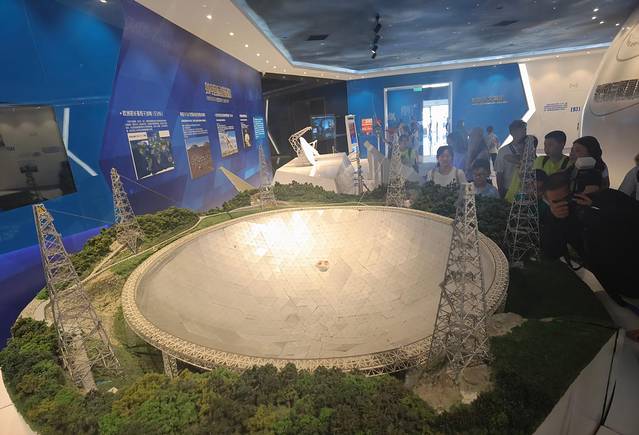 经过4小时车程,下午3:15到达中国天眼。充满科幻气息的天文体验馆,空间黑洞模型、航天器模型、卫星模型、太阳系八大星系模型等映入眼帘,仿佛置身于宇宙,非常震撼,应该说,是第一次完整地欣赏这些天体。下午4:00,也就是最后一批进入天眼基地的时间,一行人卸去身边所有的电子产品,手机、耳机、充电宝,就连机械手表也不放过,带上纸质人民币,坐上接驳车,在深山里绕来绕去,前往基地。到达基地,向上走了100来个台阶,望向群山,伟大的天眼呈现在眼前,同时肃然起敬,向南仁东教授致敬,因为有你,才有中国天眼,才能因此傲立于世界。接下来,自然是一些的常规操作,感叹,打卡拍照,只不过不同的是没有自己的设备记录,有工作人员完成(拍照每次30元,人民币交易),工作人员的拍照也是用胶卷,没有用数码相机,看来此处要保证绝对的零干扰。在山间的零售店,购买了2个FAST的纪念章(网上买不到的),看来一下产地,居然是浙江产的,不错,浙江人很会做生意。参观结束,又是乘坐接驳车在回到出发点,出景区后,又到了饭点,来到景点的特色饭店,吃上了贵州特色的菜品,那天恰好是生日,又为自己增点了贵州特色菜,小炒黄牛肉、酸汤鱼,特色麻糍等,自己点的果然不错,证明了一句话,要吃特色菜,一定要自己点,否则都是改良的特色。