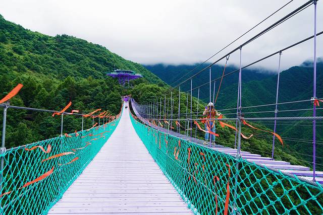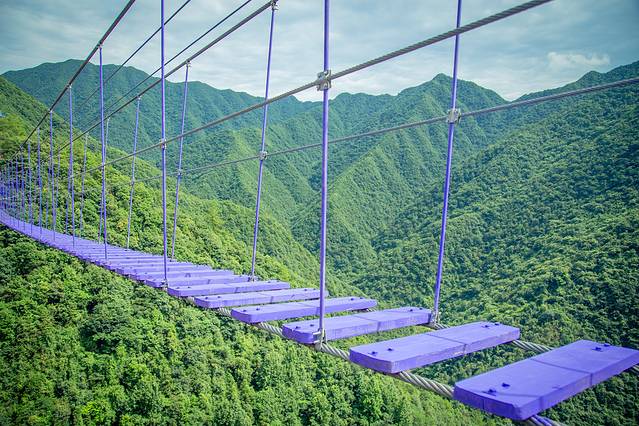 如果说“紫绫纤手”适合拍照打卡,那么后面的步步惊心则适合勇者来挑战,距离地面800米的高空中有一条长300米的木板钢索吊桥,中间是镂空设计,每一步都感觉行走于云端,惊心又刺激。