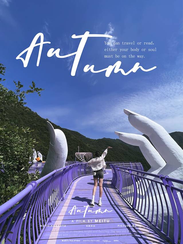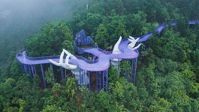来到山上便到了景区第一个体验项目紫绫纤手,一条紫色的悬空长廊横跨在山间,由两张巨大的芊芊细手托举而起来,与后面的山峰形成了一幅绝美画面,非常适合拍照打卡~