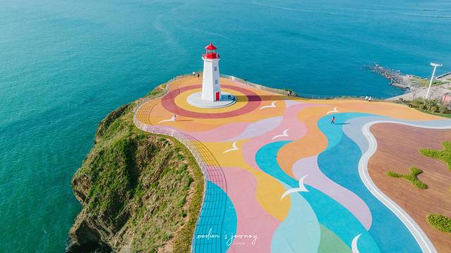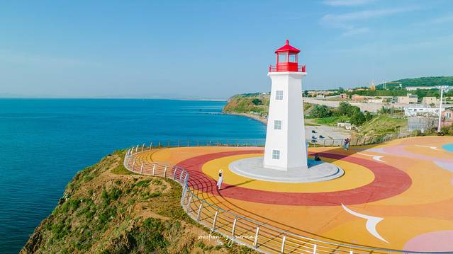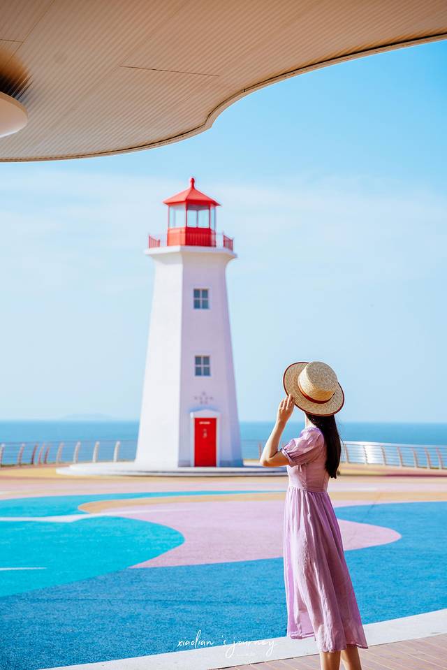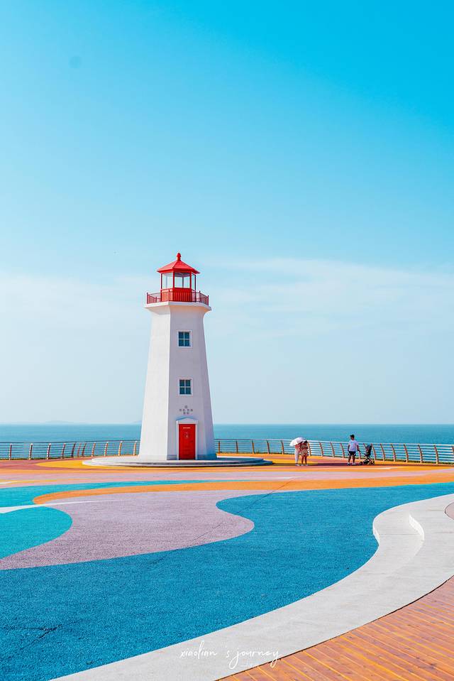 泊霞湾是大连新晋的打卡地,这里有一座红白相间的灯塔,灯塔下的地面上是七彩色的拼接,无论从地面上看或是航拍都非常漂亮。