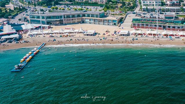 漫长的海岸线边热闹非凡,在海边晒太阳的、在海里玩水的、在遮阳篷下烧烤的人群都洋溢着幸福的笑脸,这便是玩水、烧烤的夏天呀。
