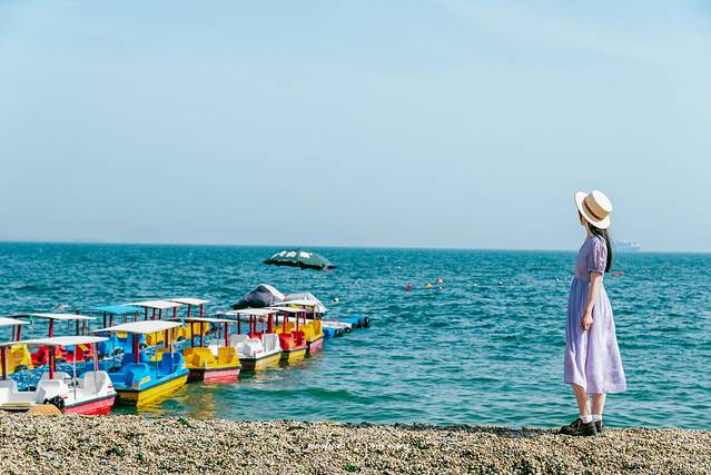但是与很多海边不一样的是,泊石湾海滨浴场边没有细软的沙滩,海边都是由鹅卵石铺就而成,我们笑说光脚走在这里可以做免费的足疗了~哈哈哈