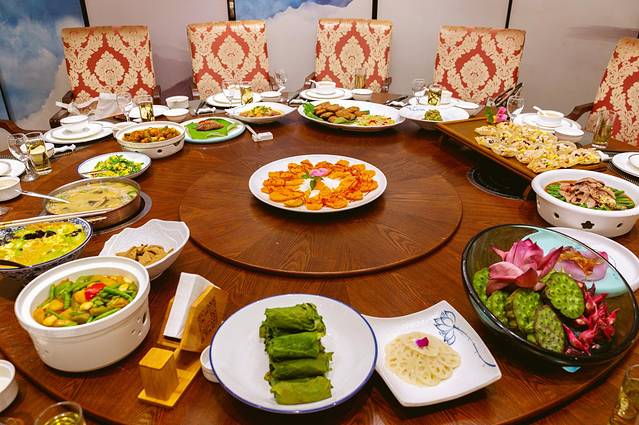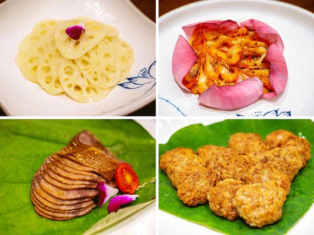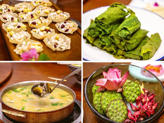 荷花荡荷花宴就地取材,食材是荷花新鲜的根茎叶,经过搭配精心制作出了香煎藕饼拼荷塘月色、荷香糯米卷、香酥荷花瓣、糖醋藕片、莲藕红枣炖老鸽子、荷花瓣浸河虾等特色美食,不仅看起来色泽诱人,吃起来那也是让人忘不了。