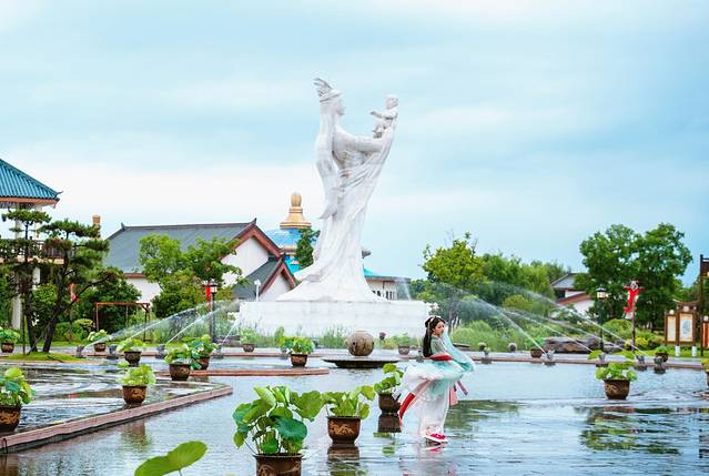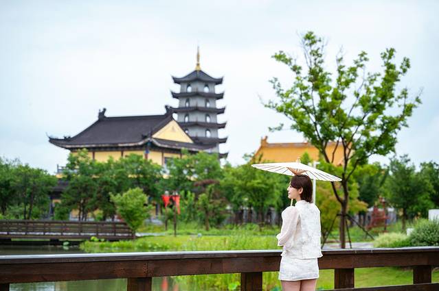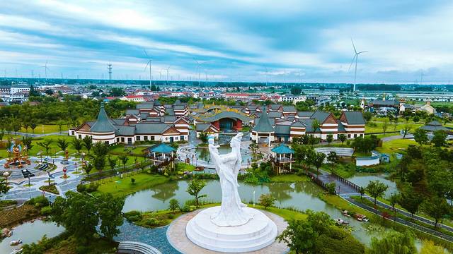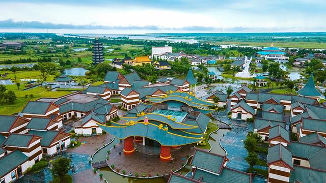 这里有一座如游戏世界里一样的仙侠古城,它坐落在淮河入江水道旁,从高空俯瞰,造型奇特的建筑上是青绿色的屋顶与朱红色或金黄色的檐角,交相辉映,给人一种穿越了时空的错觉,这里是尧想国文化旅游区,一座遥想上古传奇的地方。