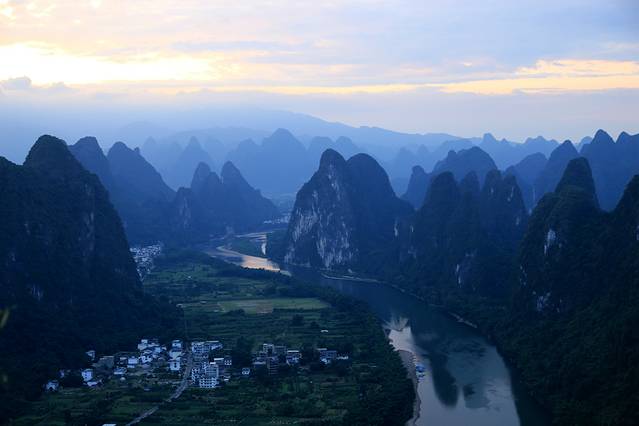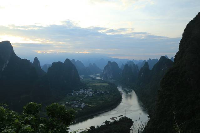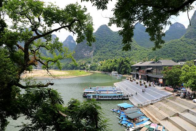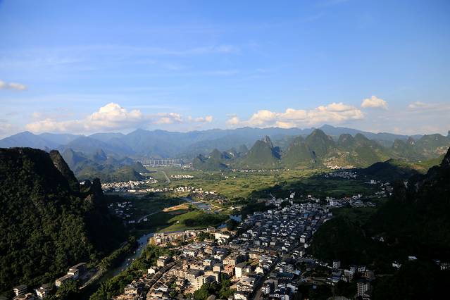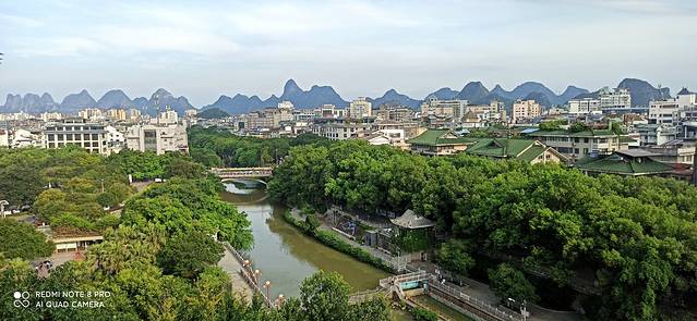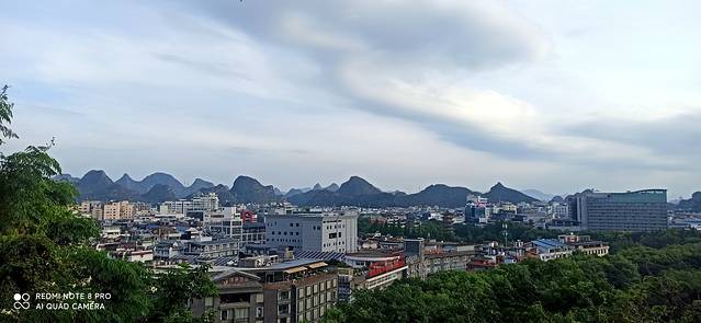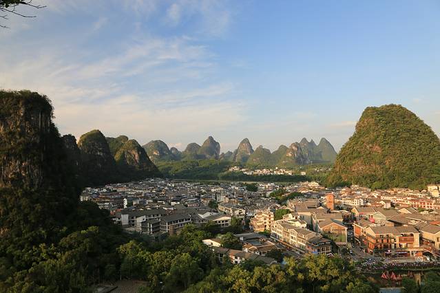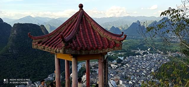 下午到阳朔后从码头出来,有那种敞篷观光车10元一张票送你去阳朔的东南西北。到民宿放下行李准备去西街,快到西街路口是看见阳朔公园,进去溜达一圈爬上山顶,可以鸟瞰阳朔城。