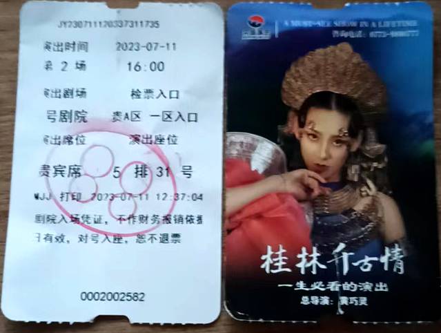 下午4点桂林千古情开演,别去官网买票(贵),就在景区门口有人搭讪买票,前排(贵宾)票165,普通票150