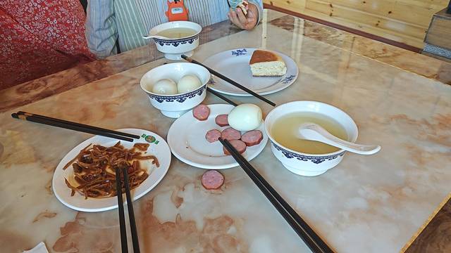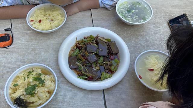 辣炒羊血,鸡蛋汤,醪糟,丸子汤,三种半笼包子共12个,包子味道不错。