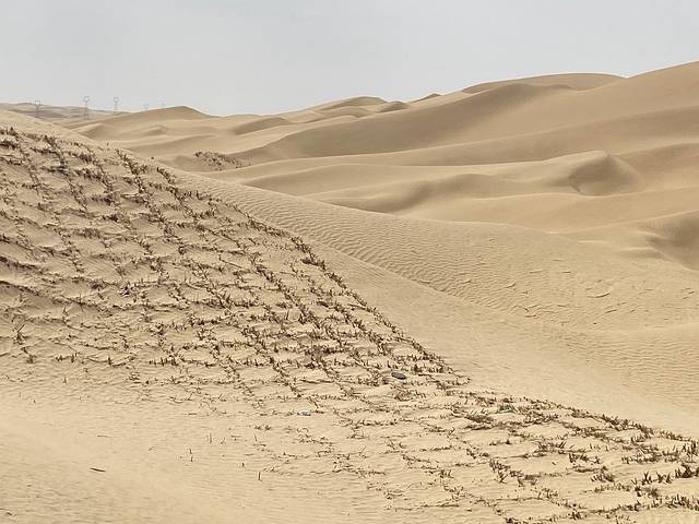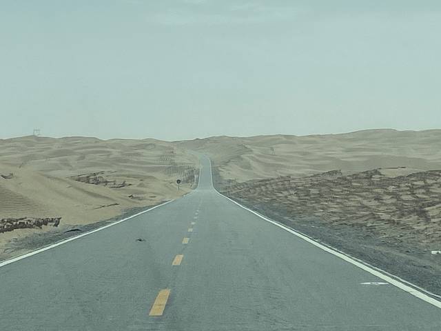 塔中镇到且末经过的233省道,也是沙漠公路。沿途的沙漠比昨天下午经过的G216国道,民丰至塔中镇那段的沙漠更好看。公路两旁没有固沙的红柳,而是用芦苇秆固定的方格;也没有水井坊;路更平整,老司机开出了高速的速度。