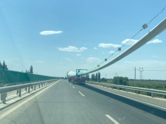 路上看到大货车托运发电风车的叶片。很长。震撼!
