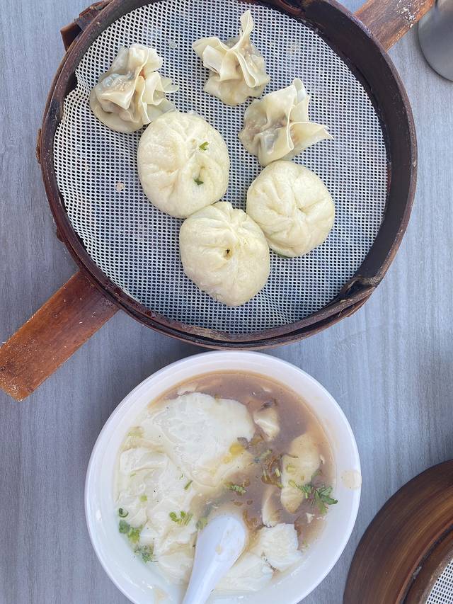 在精河县吃的早餐,素菜包、牛肉饺、水豆腐、酸辣汤。