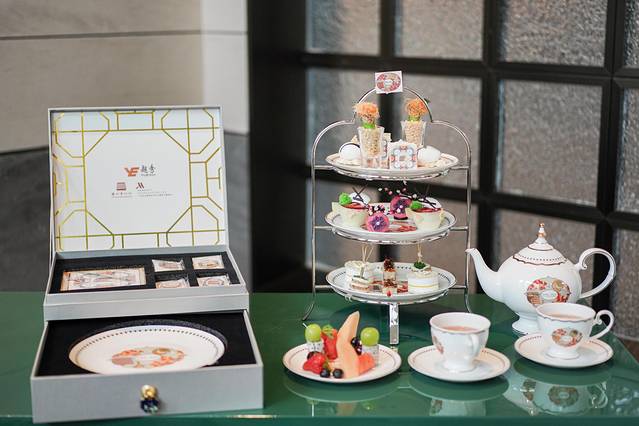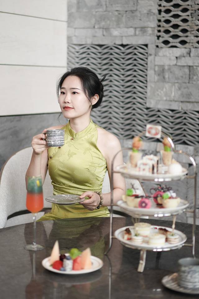 穿着中式服装,在优雅别致的的万豪大堂酒廊,宽敞的落地玻璃窗让窗外中式庭院风光一览无遗,有种时空交融的错觉。和朋友相约,在写意的酒廊中品味“老城标,新活力”主题联名下午茶,甜品甜蜜,水果清甜,边喝下午茶边聊聊近况,弥漫齿间的甜蜜太令人满足了。