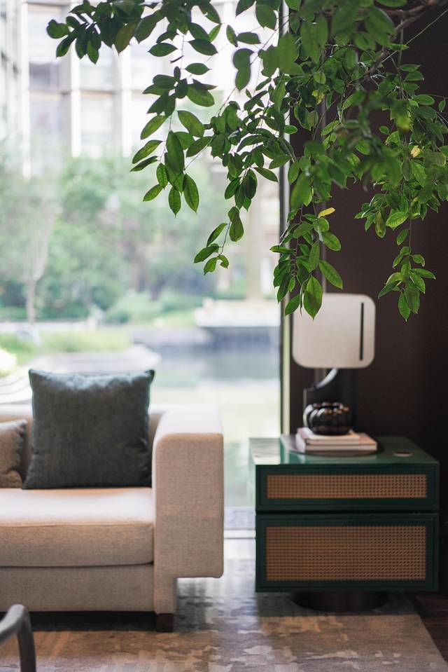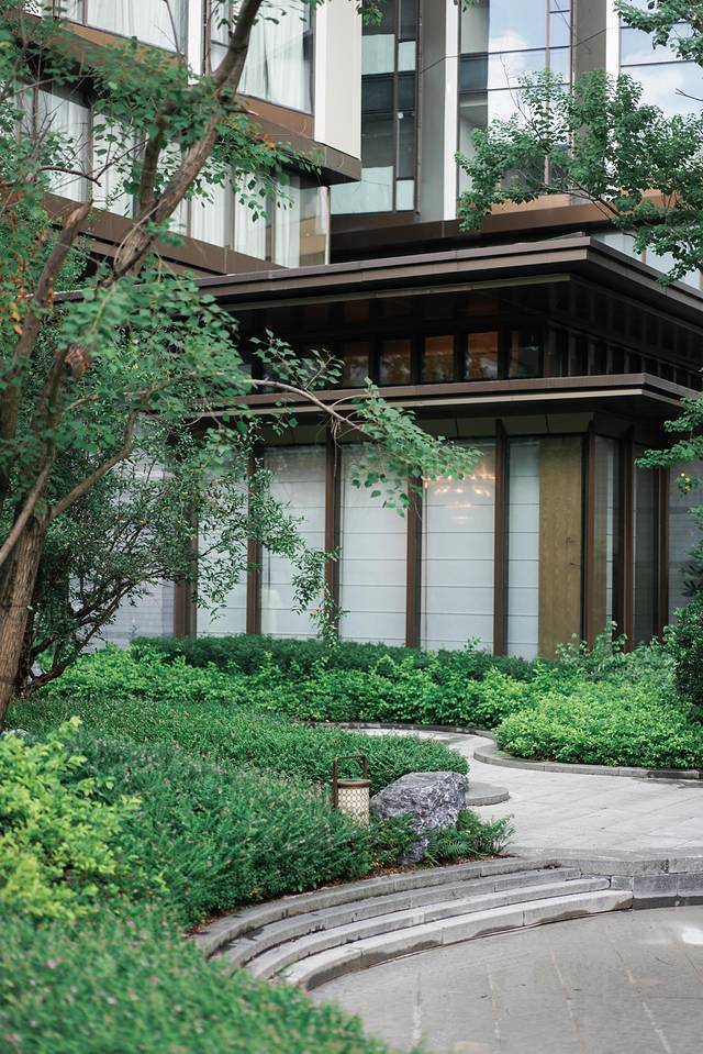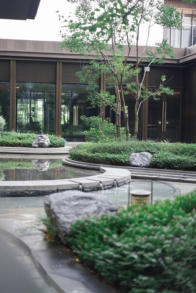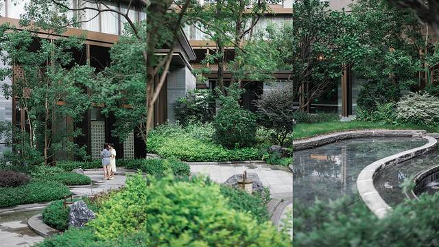 一进去,便宛如到了另一个世界,绿树周垂,甬路回转,流水戏青石,白墙伴黛瓦,整个院落一步一景,让人沉迷。庭院的灵感源自岭南庭院的空间布局,传承了岭南传统庭院的精髓,保持着传统建筑融古雅、简洁、富丽,以大自然的绿植为皈依,呈现曲折多变的岭南园林之魅,将“云中院、院中景”的意境淋漓展现在公共区域。
