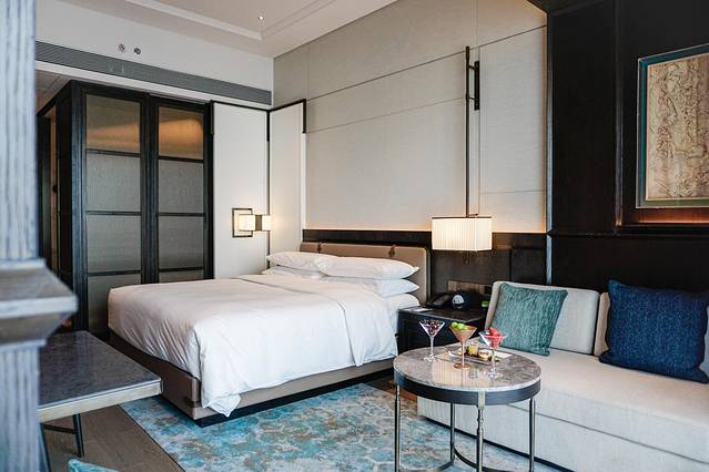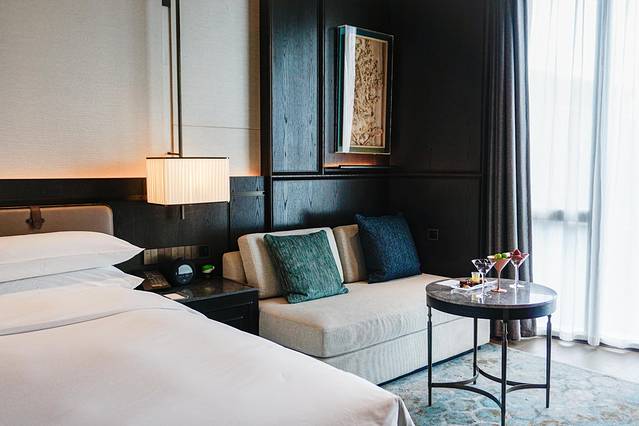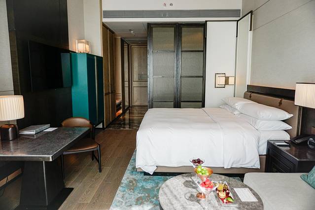 我可太喜欢客房了,客房用优雅温润的玉石色调搭配柔和舒缓的大地色调,打造出优雅别致的格调空间,给人一种温馨安静的舒适感。很喜欢小沙发后悬挂的木雕艺术品,在细节处把岭南文化展现得淋漓尽致。