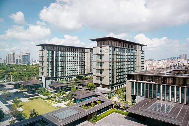 这是由广州白云国际会议中心越秀万豪酒店、广州白云国际会议中心越秀福朋喜来登酒店及广州白云国际会议中心越秀源宿酒店形成的酒店群,三家酒店风格各具特色,共享绿柳周垂的岭南园林庭院。