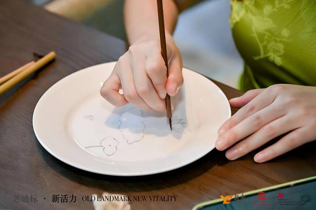 当天恰好是“老城标,新活力”主题联名下午茶的发布会,邀请了广彩老师到场教学,这沉浸式「文物」体验我当然不会错过啦,在老师的细致讲解下,一笔一划描绘出自己的创意,身临其境的感受岭南文化和西方经典融合创新。