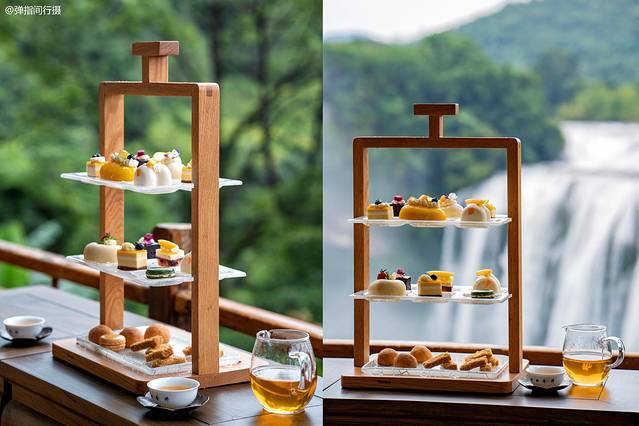 在此享用精致下午茶,绝对是无与伦比的体验。独享观瀑露台,瀑前观瀑品茗,抬头即可直面黄果树瀑布。群山环抱的瀑布飞流直下,飞溅的水花变成渺渺白烟,眼前胜景,宛如仙境。