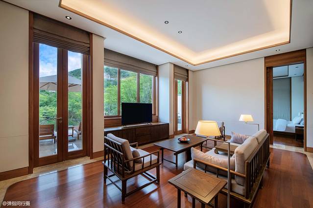 客房沿袭柏联一贯的风格,内饰以中式风格为主调,家具、门框、窗框等都统一采用柚木材质,门把手、窗户开关等五金配件都是黄铜,地面地板圆弧拼接大理石来转折,建材高级而简约,古典韵味十足,透露出静美、雅致和谐的气韵。